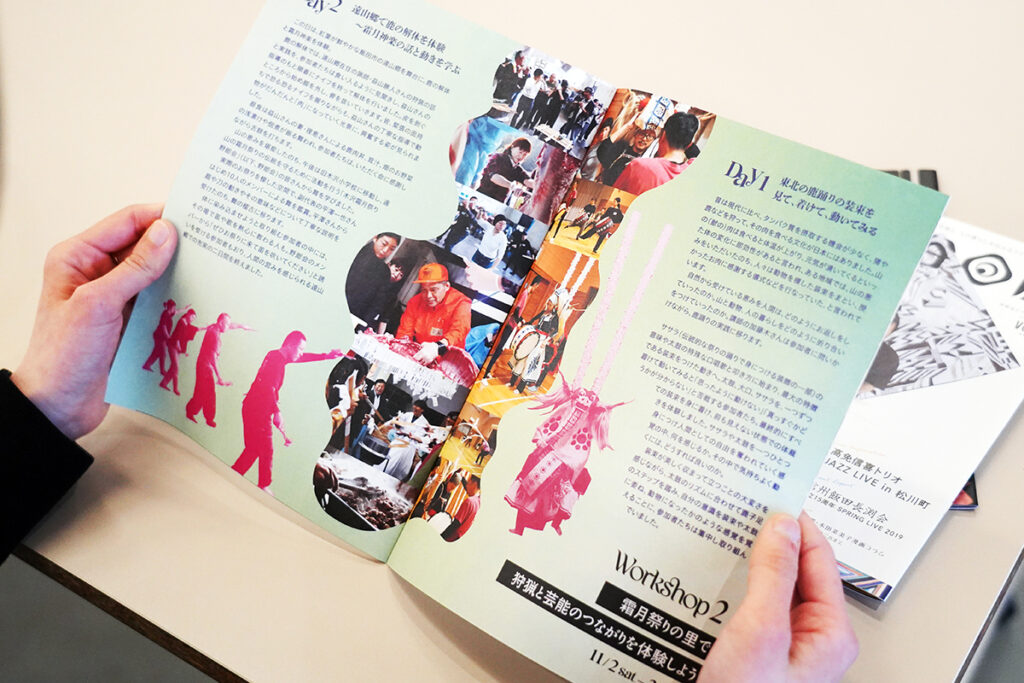 ページをめくると、和太鼓サークルや人形師、舞踏家、ダンサーなど、南信州を拠点に芸術・芸能分野で活躍する多彩な表現者たちの声や、地元の学校や商店街でのアートに関する取り組みの紹介記事などが、鮮やかなデザインに彩られ、目に飛び込んできます。