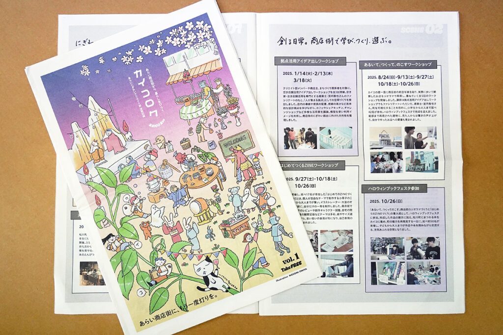 「期待通り、カイコを立ち上げると、日に日に声をかけてくれる人も増えてきて、チャレンジショップ(古着屋さん)をやりたい人も出てきて。祇園祭の日は、缶バッチをつくるワークショップをやったり、夏休みには工作、その後もジオラマづくり、お絵かき、自分でフリーペーパーをつくろうなどなど、知り合いの得意を寄せ集めていろいろなワークショップを開催しました。いろいろなチャレンジがこの「場」から生まれている実感があります。
